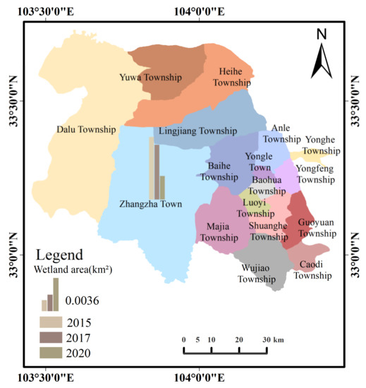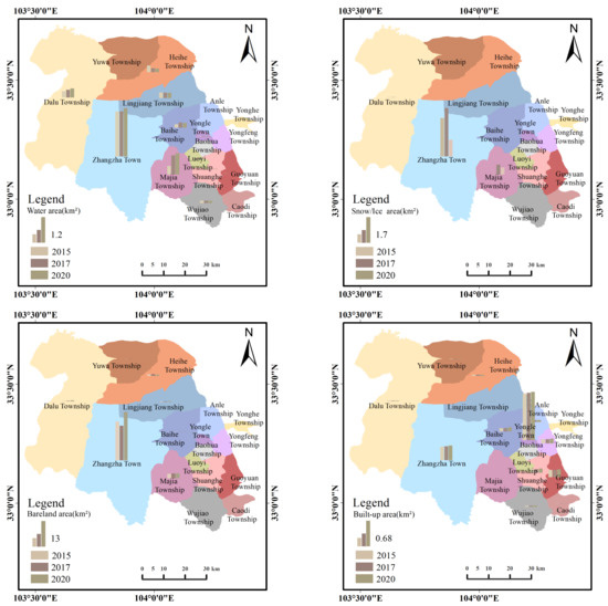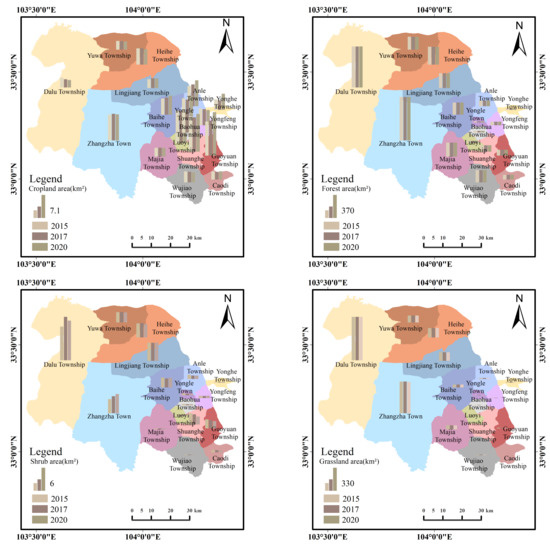 Figure 7 shows the spatial pattern distribution of land cover changes in each township in the study area before and after the earthquake. The areas with large changes in cropland types before and after the earthquake are mainly distributed in the eastern part of the study area. From 2015 to 2020, the cropland area of Guoyuan Township, Anle Township, and Baihe Township increased year by year, and the cropland area of Yonghe Township, Baohua Township, and Shuanghe Township, under the comprehensive impact of earthquake and human activities, decreased slightly in 2017, but also showed an increasing trend. Before and after the earthquake, forest area in the study area changed little, and the distribution of forest types was greater in the west and lesser in the east. Zhangzha Township and Dalu Township were the two areas with the largest distribution, accounting for 21.6% and 20.4% respectively. The earthquake had a great impact on the shrub types in Dalu Township, and the shrub area in this region increased from 9.31 km2 in 2015 to 12.02 km2 in 2017, and then decreased to 10.96 km2 in 2020. In terms of grassland type, 12 of the 17 townships in the study area showed a trend of first increasing and then decreasing under the comprehensive impact of earthquake and human activities. The bare land type is mainly distributed in Zhangzha Town, and the bare land area decreases first and then increases before and after the earthquake. From 2015 to 2020, the built-up area in the study area showed an overall growth trend, which may be caused by the rapid economic development in the study area and the large number of residents in need of resettlement after the earthquake. The wetland type was mainly distributed in Zhangzha Town in the study area, and the area of the wetland type showed a decreasing trend before and after the earthquake.