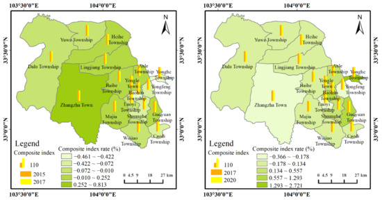 From 2015 to 2017 (Table 5), the comprehensive index of land-use degree of most townships in the southeast of the study area showed different degrees of decline, and the greatest degree of decline was in Yonghe Township, with a change rate of −0.46%. From 2017 to 2020 (Table 5), most of the land-use degree indices of the townships in the study area recovered, and the areas with a large increase included Yonghe Township, Guoyuan Township, Anle Township, and Yongle Town. The change rates were 2.72%, 1.09%, 0.56% and 0.50%, respectively. The reasons for the above phenomena include the following. First, the southeast part of the study area has convenient transportation, frequent human activities, and a good economic development level, which is greatly affected by the earthquake. Second, after the earthquake, due to the direct destruction of the earthquake and geological disasters, part of the cropland in the region was converted into shrubs or grasslands, which led to the reduction of land use degree. Third, the southeastern part of the study area has a high population density and strong human reconstruction activities. With the promotion of post-disaster reconstruction and the drive of relevant land policies of the government, the built-up area increased due to the large number of residents’ resettlement after the earthquake and the rapid restoration of cropland damaged by the earthquake, so the land use degree index rose rapidly.