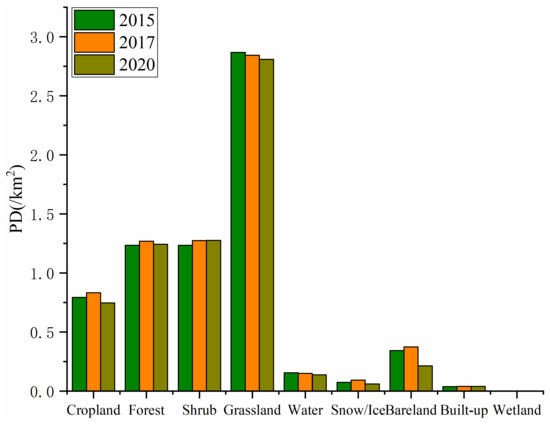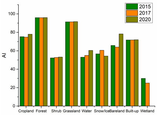Figure 9, Figure 10 and Figure 11 show the temporal variation trend of landscape PD, LSI, and AI indexes before and after the earthquake. Compared with 2015, the PD of cropland, forest, shrub, snow, bare land, and built-up land in the study area showed an increasing trend after the earthquake. From 2017 to 2020, except for the PD of the built-up type of land, the PD of other land types in the study area showed a downward trend. Compared with 2015, except for the LSI of wetland, the LSI of other landscape types in the study area showed an upward trend after the earthquake. From 2017 to 2020, except for the built-up type, the LSI of other land types showed a downward trend. Compared with 2015, the AI of cropland, forest, grassland, and bare land in the study area showed a downward trend after the earthquake. From 2017 to 2020, the AI of cropland, forest, grassland, and bare land in the study area showed an increasing trend.