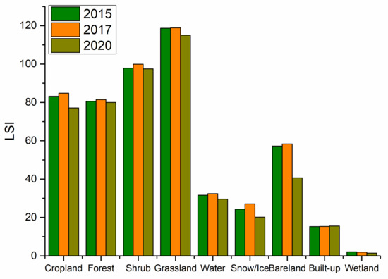 Spatial distribution of LSI landscape index values from 2015 to 2020 in Jiuzhaigou County.