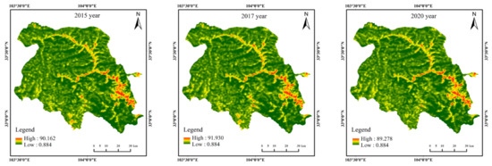 It can be seen from Table 7 that, during 2017–2020, with the ecological restoration and artificial restoration over time in the study area, a large number of grassland types were transferred out, and the area of grassland converted to cropland and forest was 12.80 km2 and 6.88 km2, respectively. The results show that, after the earthquake, under the artificial repair and reconstruction, the earthquake-damaged farmland is restored again. In addition, part of the grassland has been turned into forest, indicating that the ecological environment damaged by the earthquake is gradually being repaired.