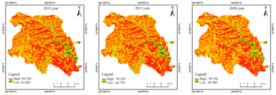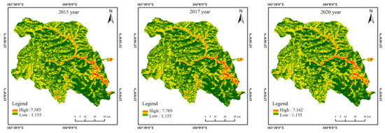Figure 8 shows the spatial pattern distribution of land-use degree before and after the earthquake at the township scale in the study area. The comprehensive index of land-use in the three periods did not change much, and the values were all around 200. The main reason was that the study area had lush vegetation and a high proportion of forest types, among which the forest area of Caodi Township and Wujiao Township accounted for about 94%.