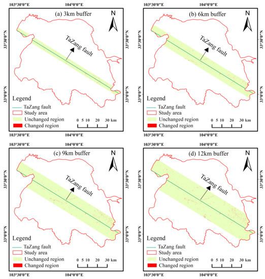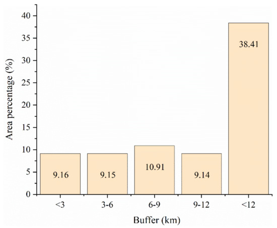 This paper draws on the existing research results [49,50,51]. Taking the study area of the Tazang fault zone as the center, the change rules of land cover before and after the earthquake were quantitatively expressed in the 3 km, 6 km, 9 km, and 12 km regions (Figure 15). The results showed (Figure 16) that the land cover change area within 0–3 km, 3–6 km, 6–9 km, and 9–12 km of the Tazang fault zone accounted for 9.16%, 9.15%, 10.91% and 9.14% of the total land cover change area, respectively, mainly distributed in the southeast of the study area. The results show that, under the influence of the Tazang fault zone, the closer it is to the Tazang fault, the greater the land cover change and the more serious the land damage, except for at the range of 6–9 km. In the range of 6–9 km, human activities are frequent, and the surface landscape is more complex, resulting in greater land cover change and more serious land destruction.