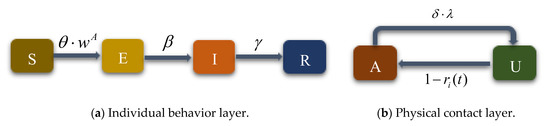 Epidemics can be spread via the air, water, food, contact, soil, vertical transmission, etc. To stop some illnesses from spreading, the epidemic prevention department must stay up to date on their incidence and take prompt action. In the pre-epidemiological time, the combined transmission of disease and information was taken into consideration, but it tended to concentrate on single-layer networks [36,37]. Different networking layers were involved in both the spread of disease and the propagation of information. Granell et al. [38] therefore attempted to research the coupled dynamics behavior on two-layer networks with the dissemination of disease information and the propagation of disease. The SEIR (Susceptible-Exposed-Infected-Recovered) model with individuals with latent states is constructed here [39,40]. As shown in Figure 2: