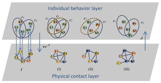 According to the dynamic evolution mechanism of social networks and the spread of epidemics, this paper constructed a two-way coupling mechanism as shown in Figure 3. In the coupling model, the upper layer represents the individual behavior layer, and the lower layer is the physical contact layer. The degree of information forgetting, and the person’s social aptitude are used to achieve the two-way influence. This article assumes that the total number of nodes in the hyper network is , and each hyper edge contains nodes.