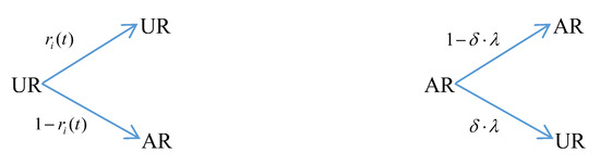 Among them, is the local awareness threshold. and , respectively, represent the adjacency matrix of the behavior diffusion layer and the physical contact layer at time t. When the probability of AI transitioning to AR is , represents the probability that the state of the aware node has not changed at time t, and similarly, represents the probability that the state of the unaware node has not changed at time t.