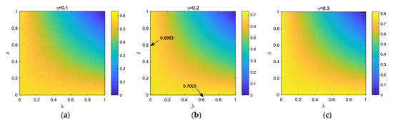 The effect of and on the proportion of aware recovered individuals under different recovery rates . The layout (a–c) is the result when was 0.1 (a), 0.2 (b), 0.3 (c), and the ranges of and were both [0, 1], at this time, . The figure shows 200*200 results obtained under different parameter values.