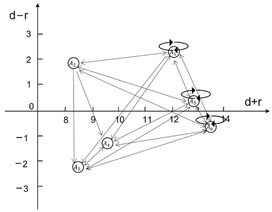 With reference to the suggestions of experts, the lower value in the comprehensive matrix T, that is, the value without significant correlation, is removed to simplify the relationship network between indicators. In this paper, the threshold value is set to 0.940, and all values lower than the threshold value are deleted to obtain the adjusted comprehensive impact matrix (shown in Table 4). Next, calculate the values of d, r, d + r and d − r according to Equations (5) to (8) (as shown in Table 5), and then draw the causality diagram (as shown in Figure 1) with d + r as the abscissa and d − r as the ordinate.