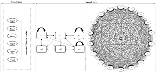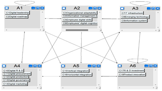Step1: The establishment dimension of this indicator is based on six dimensions proposed when evaluating the digital readiness of Italian SMEs, namely strategy, personnel, technology, process and integration [5]. We consulted 10 information department managers or digital transformation leaders of different types of small- and medium-sized manufacturing enterprises in Guangdong Province, 5 university digital research experts and 5 Industry Association experts; these experts have worked in relevant fields for more than 10 years. Thus, the evaluation of small- and medium-sized manufacturing enterprises is determined, and the dimension of digital innovation is added. Then, 18 criteria were obtained by extending 6 dimensions: digital strategy (A1), including digital leadership and digital roadmap; organization and people (A2) includes organizational adaptability, information management department, employee digital skills and employee digital cognition; information technology (A3) includes IT infrastructure, emerging technologies and information systems; enterprise process and management (A4) includes digital R&D, digital procurement, digital production, digital governance and digital marketing; integration (A5) includes vertical integration and horizontal integration; and enterprise innovation (A6) includes R&D investment and product innovation. Experts evaluate the importance of the standard by scoring. The direct impact matrix A is obtained as shown in Table 2.