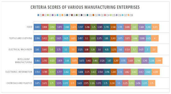 For small- and medium-sized manufacturing enterprises, it is obviously unreasonable to adopt the same indicators for digital maturity evaluation as for large enterprises. Therefore, this paper constructs the index system by sorting out the literature and combining the expert opinions. Digital leadership (C1) plays an important role in the process of enterprise digital transformation and is an important indicator to measure the maturity of digital transformation [11,19]. Digital roadmap (C2) can effectively promote the digital transformation of enterprises, which can usually be evaluated from the perspective of consciousness and behavior [47]. Organizational adaptability (C3) can flexibly adjust the organization to adapt to digital changes as soon as possible and win competitive advantages; in addition, in the organizational structure, whether the information department (C4) is set separately is also a manifestation of whether the enterprise informatization construction is professional [31,37]. In addition, in the process of digital transformation, the supporting role of human resources is indispensable and plays a key role in implementing and achieving a higher level of digitization [24,26,27]. Therefore, the employee digital skills (C5) drive organizations’ competitiveness and innovation capacity [48], and employees’ digital cognition (C6) of employees affect the process of enterprise digitization to a certain extent and can promote or hinder enterprise digitization [49]. IT infrastructure (C7) is the most basic condition for an organization to carry out digital transformation, and it is an important indicator to measure whether digitalization is mature [12,18,20]. Enterprises should be equipped with infrastructure consistent with digital strategy to adapt to the future development environment. IT requirements of digital projects include: development, integration and maintenance of enterprise information system (C9), including hardware, software, data and business process layer; management of infrastructure such as internet of things equipment and servers; collect, store, analyze and distribute data, and manage data analysis [28]. Among them, the application of emerging technologies (C8) such as big data and artificial intelligence will greatly improve production efficiency and reduce operating costs [26].