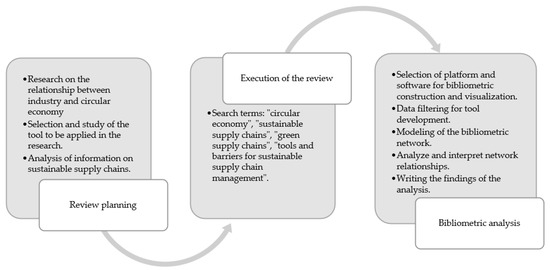 Methodologically, exclusion and inclusion criteria were used, developed in a line of action that consisted of three phases: (i) planning of the review, which consisted of a previous review of issues related to industry and the CE, selection and study of the tool that would be applied for the development of the research and review of information related to sustainable supply chains, with the purpose of organizing and directing the study; (ii) execution of the review, for which information analysis was carried out in different search engines, using keywords such as “circular economy”, “sustainable supply chains” and “tools and barriers for sustainable supply chains”; and (iii) bibliometric analysis, which involved selecting a search engine compatible with software for building bibliometric networks, filtering information (articles) according to the inclusion and exclusion criteria, analysis of the modeling results and description of the findings (Figure 1).