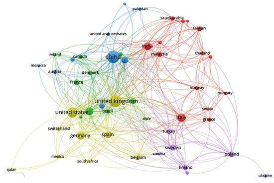 Five groups (clusters) of countries are evident, each represented by a different color (Figure 2). The size of a country’s label and circle is determined by the number of publications in the country and the weight of the article. The higher the number of posts a country has and the weight of an article, the larger the country label and circle will be. Graphically representing the network makes it easy to visualize the interactions between the five groups. Each group is determined by the size of the sphere and a characteristic color that interact depending on the level of collaboration. The larger the sphere, the greater the collaboration and number of publications in each of the countries taken for analysis. However, when one interacts with other countries belonging to other clusters, the proximity between the countries does not represent their geographical proximity, but instead the collaboration between them (Figure 3).