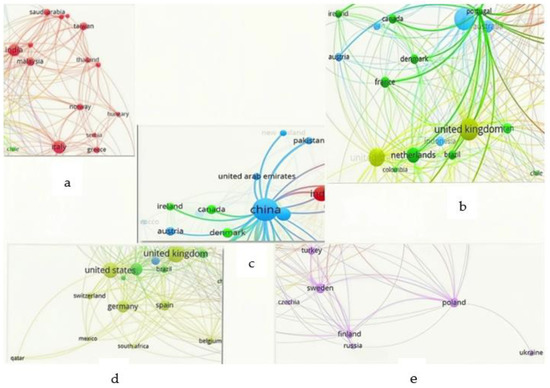 Network diagram analysis of the co-authorship–country relationship; (a) red cluster; (b) green cluster; (c) blue cluster; (d) yellow cluster; (e) cluster violet.
