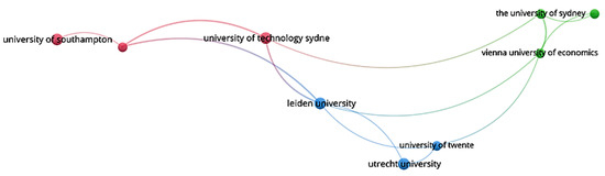 Figure 4 shows the main institutions that have the greatest inter-collaboration with respect to scientific dissemination related to the sustainability of supply chains. These institutions, which have co-authorship among them, are as follows: the University of Southampton, University of Leiden, University of Twente, University of Utrecht, Vienna University of Economics and University of London. The University of Sydney and Sydney University of Technology belong to Oceania.
