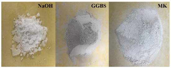 Figure 1 demonstrates the typical raw materials selected in the mix proportions, in which the dry powders are composed of metakaolin (MK) and ground granulated blast-furnace slag (GGBS). Table 1 shows the ingredients and mass fractions of the used compositions, GGBS and MK, in which GGBS is S95 level and MK is produced by Hunan Chaopai Technology Co., Ltd. Figure 2 demonstrates the granularity distribution of cumulative volume content versus particle size in the compositions of GGBS and MK. Moreover, the alkali-activator is made from the mixed solutions of sodium hydroxide and sodium silicate, in which the sodium hydroxide solution is produced using water and tablets with analytical purity, and the sodium silicate solution has 34% concentration with 3.3 molar ratio of SiO2 to Na2O.