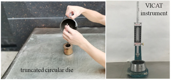 Setup of truncated circular die and VICAT instrument.
