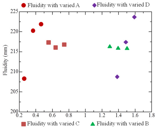 Geopolymer fluidity with varied mass fractions of raw materials in mix proportion.