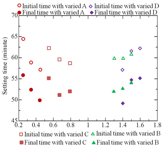 Setting times with varied mass fractions of raw materials in mix proportion.