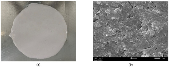 Recommended geopolymer material and SEM image. (a) Geopolymer material with recommended mix proportion. (b) SEM image at 10,000 times.