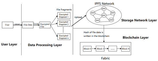 The decentralized storage framework designed in this paper is generally divided into four parts, which are user layer, data processing layer, storage network layer, and blockchain layer. The user layer is mainly for registering users, and the user status is divided into ordinary users and administrators. The system has an access system, and only the administrator agrees to apply for registration as an ordinary user. The data processing layer is mainly responsible for data uploading, downloading, encryption, and slicing. The storage network layer uses the IPFS network protocol, which is responsible for connecting the various nodes that join the network through P2P technology to store the processed data fragments. The blockchain layer uses a federated chain, which mainly interacts with the outside world through smart contracts and is responsible for uploading metadata such as file hash, file name, owner, etc. Users can find the metadata of the stored files on the chain at any time and then retrieve their files.