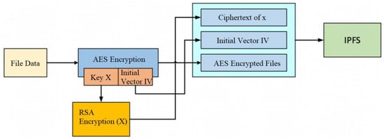 The operation flow of the whole framework is shown in Figure 1. When users store data, they need to first encrypt the data files using RSA (Rivest–Shamir–Adleman) combined with an AES (Advanced Encryption Standard) double encryption algorithm, and then the encrypted files will be fragmented according to certain rules, and the file fragments will be uploaded to the IPFS network. The IPFS network will generate the hash of the uploaded file and finally store the file hash, file name, and owner in the form of a JSON file on the blockchain. When users download data, they need to get the storage address of the file first. The address of storage file on the IPFS network is determined based on the contents of the file, so only the file hash needs to be found (file hash is the value obtained by hashing the file content). Users need to check the hash value of the data from the blockchain first, get the encrypted data on the IPFS network through the hash value, and finally decrypt the encrypted data to get the original data.