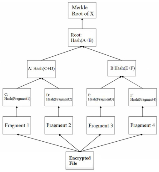 Data fragmentation is to split the encrypted data into fragments of size N (256KB by default), and the remaining part less than N is filled with 0. Then these fragments are scattered and stored on each node, and finally the hash value of these fragments after taking the hash constitutes a Merkle tree, as shown in Figure 3. Taking the example of dividing the encrypted file into four pieces, the encrypted file is divided into four fragments, and the hash value is calculated for each of the four fragments to generate the C, D, E, and F nodes; then, the C and D nodes are combined together to calculate the hash value to generate the A node, and, similarly, the B node is generated based on E and F. Then, the root hash value of this tree is generated based on the values of the A and B nodes obtained in the previous step. Merkle root hash values need to be saved to the blockchain layer for data integrity verification.