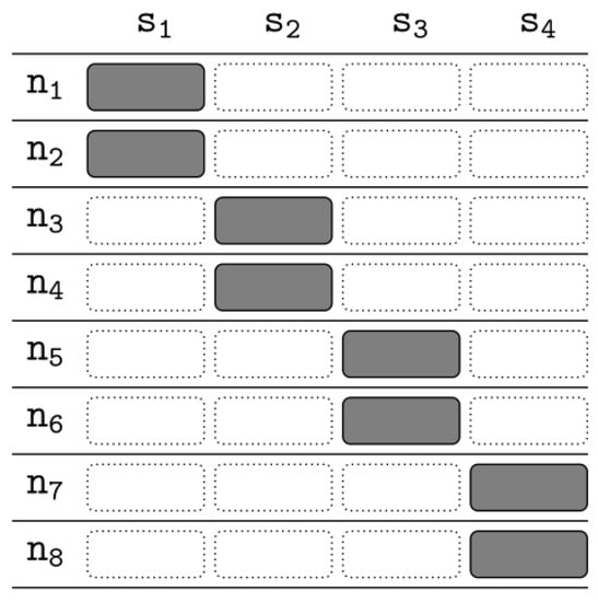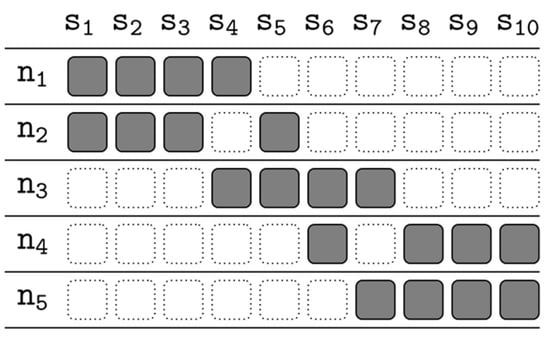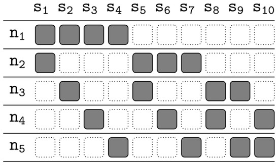 The allocation function specifies how slices are assigned to nodes in the network, and by default each slice is assigned to at least one node. Figure 5 shows an example of an allocation function that divides a file into ten slices S = {s1, s2, …, s10} with five nodes N = {n1, n2, …, n5}. There is one row for each node and one column for each slice, with a gray rectangle to indicate that the slice is assigned to that node and a dashed box to indicate that the slice is not assigned to that node. For example, indicates that the slice s1 has copies saved at the node n1 and n2.