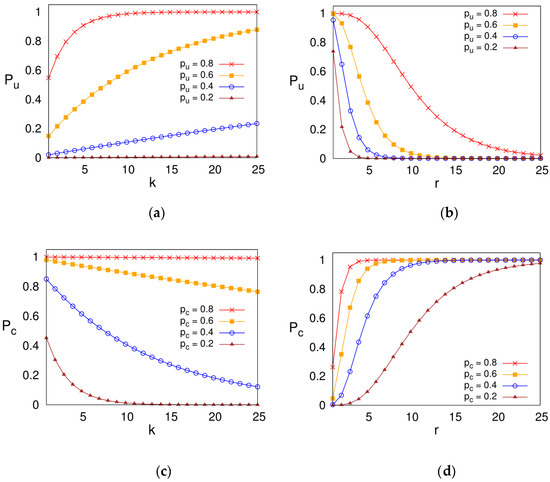 According to Formula (10), when is taken as 0.2, 0.4, 0.6, and 0.8, respectively, fixing r = 5 and varying k from 1 to 25, we can get Figure 9a, and, fixing k = 5 and varying r from 1 to 25, we can get Figure 9b. According to Formula (11), when is taken as 0.2, 0.4, 0.6, and 0.8, respectively, fixing r = 5 and varying k from 1 to 25, we can get Figure 9c, and, fixing k = 5, r varies from 1 to 25, so we can get Figure 9d.