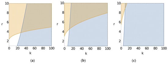 Similarly, we also classify decentralized storage systems using MNN policy into three types: (1) when = 0.001 and = 0.5, it means that this is a storage system with high reliability and low trust; (2) when = 0.005 and = 0.2, it means that this is a storage system with medium reliability and medium trust; (3) when = 0.05 and = 0.1, it means that this is a storage system with low reliability. According to Formulas (8) and (9), by changing the values of k and r, we can obtain the performance of different types of decentralized storage system using MNN policy, shown as Figure 11. The intersection of the red area and the blue area is the best setting for the k and r parameters. In Figure 11a, the probability of failure of a single node, , is 0.001 and the probability of a malicious node, , is 0.5, which is a decentralized storage system with high reliability and low trust. The optimal parameters based on the MNN policy are k = 100, r = 3, and the number of slices s = 101. Figure 11b shows a decentralized storage system with medium reliability and medium trust with the optimal parameters k = 26, r = 4, and the number of slices s = 27. Figure 11c shows a decentralized storage system with low reliability and trust with the optimal parameters k = 18, r = 7, and the number of slices s = 19.