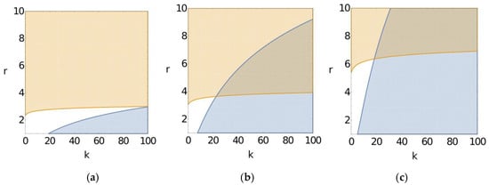 According to Formula (8), when takes 0.2, 0.4, 0.6, and 0.8, respectively, fixing r = 5 and varying k from 1 to 25, we can get Figure 8a, and, fixing k = 5 and varying r from 1 to 25, we can get Figure 8b. According to Formula (9), when takes 0.2, 0.4, 0.6, and 0.8, respectively, fixing r = 5 and varying k from 1 to 25, we can obtain Figure 8c, and, fixing k = 5 and varying r from 1 to 25, we can obtain Figure 8d.