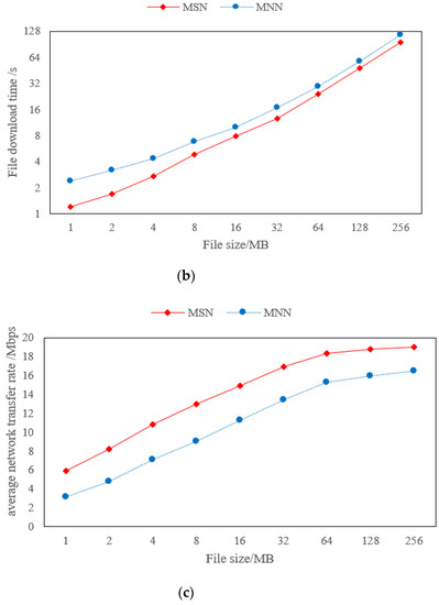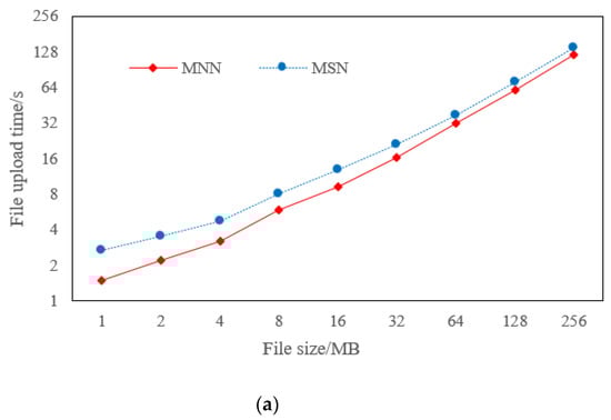 We compared and analyzed the performance of both MSN and MNN policies, including file upload time, file download time, and average network transfer rate (Mbps). We used files whose sizes are from 1 MB to 256 MB for the upload and download test and executed it ten times to take the average value. The experimental results are shown in Figure 12.