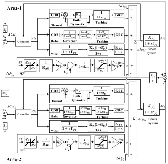 The model considered in the analysis covers conventional power plants such as thermal- and hydro- as well as renewable-based power plants (wind turbine generator), along with fleets of PEVs, as shown in Figure 1. The thermal and hydo power plant are considered base load power plants and produce 70 to 80% of total energy demand in developing countries such as India [23]. The thermal and hydro plant considered in the study is non-linear in nature as it contains several non-linearities such as Governor Dead Band (GDB), boiler dynamics (BD) and generation rate constraint (GRC) [24]. GDB is defined as the minimum time required for the start of the operation of mechanical devices. As in the rack and pinion arrangement, mechanical devices are involved, which organize the rotatory motion to open/close the valve, which causes GDB. Thus, it affects the operation of the control valves, and unusual variations in speed may occur even before any change in valve position. In the thermal and hydro plant, 0.05% and 0.02% of GDB is used, respectively. To sense the pressure and flow of steam in any unintentional circumstances, boiler dynamics (BD) is integrated in a thermal system so that supervisory action is commenced in the turbine and boiler control taps. The generation rate for either raising the generation or lowering the generation is usually predefined for a generating unit and known as GRC. So, a GRC of 3% per min for a thermal plant and 270% per minute for rising generation along with 360% per minute for lowering generation is reflected in the hydro model [8].