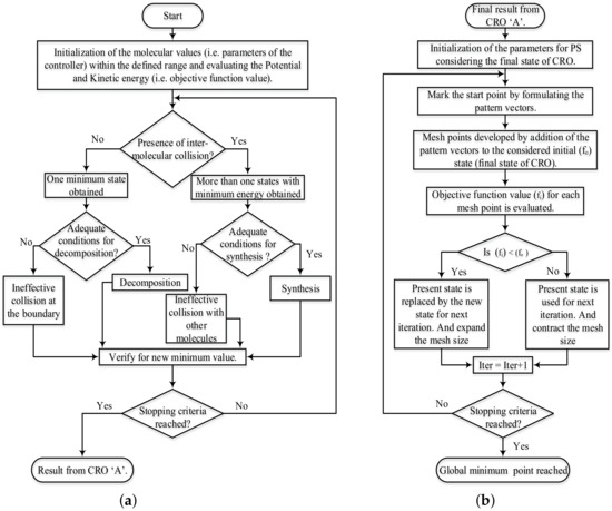 After following the above complex steps, the structural modification is completed and verified for the minimum energy state. If it fulfils the termination criteria or reaches a stable state, then it can be said that it reaches a global minimum solution. For further observation of the CRO technique, the same flowchart may be referred to, which is presented in Figure 2a.