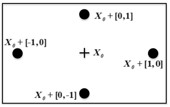 To further advance the system response and the improvised global search, an additional derivative free heuristic method called pattern search is implemented in the proposed search [30]. Moreover, not only is PS flexible for fine tuning the local minima, but also, it has characteristics of coordinated control with other optimization techniques. It starts its operation with the initial assumption of pattern vectors (i.e., [0, 1], [0, −1], [1, 0], n[−1, 0]) and forms a set of mesh points around the initial points by adding the initial vector , as presented in Figure 3. It evaluates the objective function value () for each mesh point of mesh size 1 to determine the presence of any point with a less than that of . If can be obtained, then it is referred to as the initial point for the next iteration, and the mesh size should be twice the current mesh size. Otherwise, the same process has to be repeated by modifying the mesh size to half of the current size, and the initial point remains unaltered for the subsequent iteration. Again, the same process is repeated until the termination criteria is satisfied.