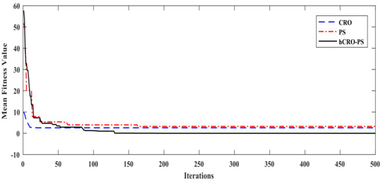 As discussed in the previous section, although kinetic energy is the prime factor for the molecular structure to escape the local minima, the same is subtracted and added in the energy buffer so as to decrease the gradually. So, this will finally converge to a global solution. However, during the process, there may be a chance that the solution becomes trapped in local minima. Hence, we introduced PS in the proposed scheme where the final state of CRO is regarded as the initial parameter for PS. Here, PS methods try to find new possible solution with a yet better value around the initial point. PS focuses on set of pattern vectors to obtain the mesh point, as discussed. However, it is not guaranteed to generate a better solution. Hence, searching around the mesh size makes sure that every new possible solution point yields a better solution for each iteration. Thus, the performance of the CRO technique can be further improved with the inclusion of a PS technique in it, as presented in Figure 2. Table 1 presents the characteristics of the considered methods in terms of execution time and memory requirement. The hybrid optimization algorithm needs more time and memory to execute the operation. Table 2 represents the performance of hybrid CRO and PS (hCRO-PS) with various extensive benchmark functions (i.e., constrained and unconstrained functions). The convergence graph of hCRO-PS is shown in Figure 4 and is obtained for a multi-source system subjected to load variation. It can be inferred from Table 2 that hCRO-PS has authority over other optimization algorithms such as CRO and PS.