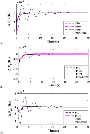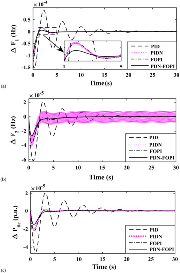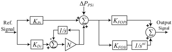 With the expansion of the test system and integration of non-conventional sources (i.e., wind power plants and PEVs), the objective of maintaining system stability is an essential task. Hence, to fulfil the above objective, a cascaded controller is proposed with optimum numbers of PDN and FOPI controllers. The cascaded controller is designed carefully by keeping the optimum features of PDN and FOPI controllers, as shown in Figure 6.