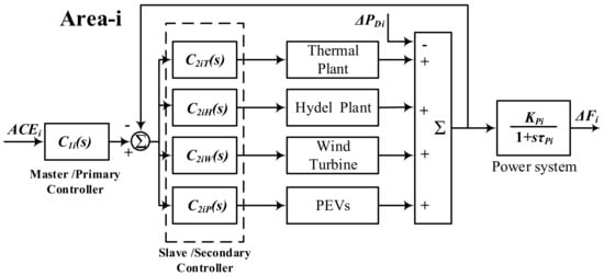 Here, is the slave/secondary controller and is termed as , , , and for thermal, hydro, wind and PEVs, respectively, whereas master/primary controller monitors the total area, and the complete configuration of the controller is projected in Figure 6 for better understanding of the derived Equations (27) and (28). The synchronized action of master and secondary controllers sets up the cascaded PDN-FOPI controller. takes signal as input and produces a corresponding control action. The secondary controllers intakes the resultant signal of the inner process output and signal from . Here, the disturbance signal is for which the stability of the system is to be analyzed.