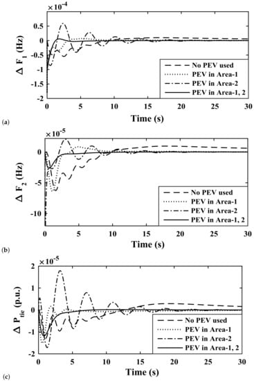 It is observed from the literature survey of AGC that most of the work tuned the respective controller gains and other parameters under nominal conditions i.e., a disturbance (step load perturbation (SLP)) of 1% in the control area. However, some other uncharacteristic conditions may have an effect on system dynamics and hence the controller parameters. To check the robustness/sensitivity of the proposed controller, a large SLP (up to 10%) and other conditions such as dynamic loading, the effect of PEVs on the system response, and the outcome of state of charge (SOC) at 0.75, 0.85, and 1 was considered in the test system. Moreover, Eigen value analysis was included in the proposed study with regard to the system stability, which was not reported in previous studies.