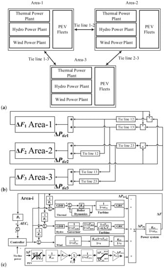 To analyze the effect of AGC on isolated systems as well as inter-related systems, various research articles are available. Elgerd et al. [4] first proposed the concept of AGC in the thermal model. Later, Nanda et al. [5] extended this study to a two-area hydro thermal system with the generation rate constraint (GRC) as non-linearity in the system. The same author also performed the analysis of AGC in a three-unequal-area system, incorporating GRC and a non-reheat turbine of a thermal plant [6]. Adding another non-linearity called Governor Dead Band (GDB), Gozde et al. [7] studied it in a two-area hydro model. However, Sahu et al. [8] used several non-linearity aspects such as boiler dynamics (BD), GDB, and GRC to draw a conclusion from a two-area, complex and realistic power system model. Bhatt et al. [9] attempted to analyze the system response with diversified sources such as hydro-thermal-diesel. Saikia et al. [10] further studied it in an interconnected single reheat system and then applied it to a five-area system. However, due to the drawbacks of carbon discharges, it urgently needed to be replaced by integrating renewable energy sources to the existing system to generate adequate demand power. Sopian et al. [11] discussed a hybrid wind–solar model with its design and possibility for household application. For the grid integration of solar power, Kadri et al. [12] discussed the variety of possibilities and methodologies with maximum power point tracking. A case study of the islands of Samso and Orkney was considered to establish the enhancements achieved through the application of Demand-Side Management actions to the available renewable energy sources and curtailment events [13]. On the other hand, plug-in electric vehicles (PEVs) represent one of the distributed energy sources, gaining popularity as they do not rely on fossil fuel, thus contributing to a clean environment by reducing the greenhouse gas emissions. Debaramma et al. [14] used PEVs in a deregulated environment and analyzed their response with fractional-order controller configuration. Padhy et al. [15] attempted to assess the performance of PEVs in a two-area model with a cascade controller. Saha et al. [16] further extended the study by including renewable sources and time delay. A method for day-ahead optimal dispatch estimation considering wind turbines, photovoltaic panels, battery energy storage systems, and electric vehicles (EVs) in a smart grid scenario was studied [17]. The application of V2G (Vehicle to Grid) technology improves the grid-side peak-to-valley ratio, significantly and simultaneously benefiting the users and the power system [18].