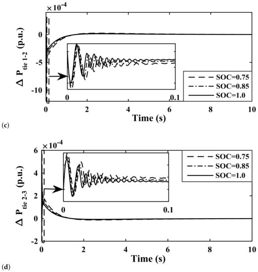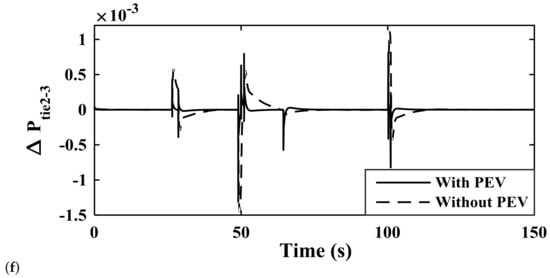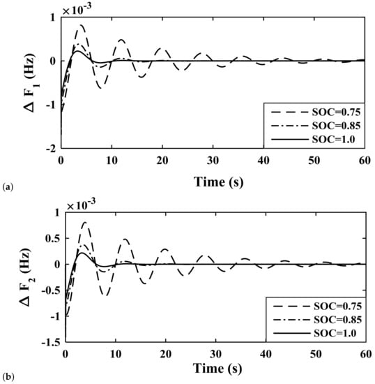 The EV model is composed of a battery charger, primary frequency control (PFC), and load frequency control (LFC). The battery charger helps the relative power flow between the grid and battery storage. To restrict the undesired frequency response during the sudden disconnection, an upper limit () and lower limit () of mHz is considered in the system. However, the value of the aggregate droop characteristics () is the same as that of conventional units (i.e., 2.4 Hz/p.u.). and refer to the EV gain and time constant, respectively, and purely depend upon the EVs’ state of charge (SOC). The value of SOC is generally varied from and is taken as 1 with respect to SOC. The incremental change in the power generation of EV fleets for area is represented by . The maximum and minimum derived power from EV fleets are referred to as and , otherwise known as upward and downward reserves, respectively. The same is calculated by the following Equations (2) and (3):