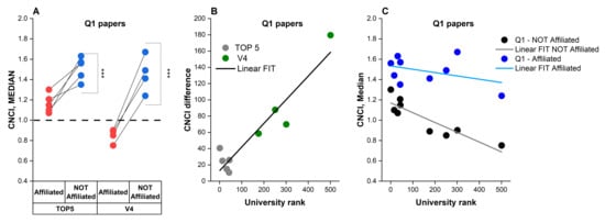 3.3. A Prestigious Byline Position of Non-Affiliated Authors Increases the CNCI for Q1 Research Papers