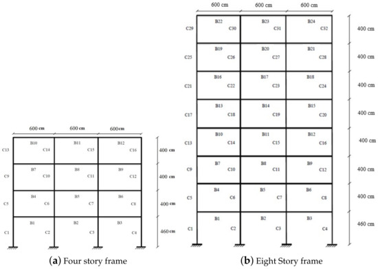 Dimensions and element assignment in each frame; C and B stand for column and beam, respectively. The properties for each member can be found in Appendix A using the element ID.
