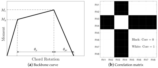Furthermore, a correlation matrix must be taken into account. In this paper, the RVs are either fully correlated or uncorrelated (i.e., no partial correlation is studied). Figure 3b shows the assumed correlation matrix [11], in which the fully correlated RVs have a correlation coefficient of and are shown in white, while the uncorrelated RVs have a correlation coefficient of and are shown in black. This matrix is basically adopted from Haselton and Deierlein [13] for RVs 1 to 6. Furthermore, we treated RV7 and RV8 (those related to ) in a same way as Haselton and Deierlein [13] treated (for RV5 and RV6).