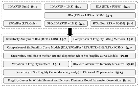 This paper compares different techniques and assumptions for developing seismic fragility functions. Therefore, the results are presented in fourteen subsections, each one with a separate target and outcome. Figure 4 provides a summary of all separate studies in this paper and the associated subsection number. The first six subsections discuss the variability in capacity functions in terms of summarized (i.e., 16%, 50%, and 84%) fractile curves and regions/bands. The remaining subsections are based on sensitivity and uncertainty in developing the fragility functions using the capacity functions.
