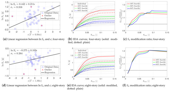 Subsequently, a linear approximation is fitted to the pair data of , as seen in Figure 6a,d. According to Haselton et al. [54], the modified IDA median and dispersion are calculated as follows: