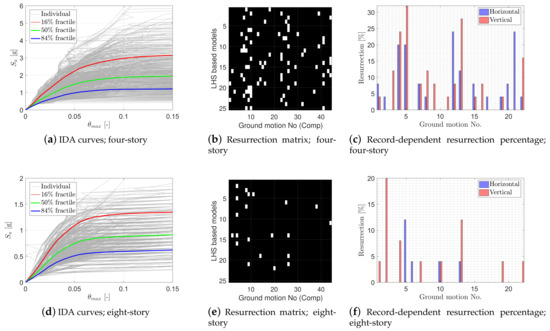 Focusing on the single-record IDA curves, several resurrection phenomena can be noted. This refers to a case where increasing the seismic intensity reduces the demand parameter. It is important to find out whether there is a systematic relation between the specific combination of LHS models and ground motion records. Figure 7b,e shows the binary matrix presentation of the resurrection phenomenon. The empty (white) cells correspond to resurrection. The major observations are: the number of resurrection occurrences in the four-story frame (81 simulations) is more than in the eight-story one (only 21 simulations). While no specific pattern is recognized in model-record combinations, all the resurrection cases for individual records are also plotted in Figure 7c,f separately for horizontal and vertical components. According to these figures, records #4, #5, #12, and #13 have a significant number of resurrection cases for the four-story frame, regardless of modeling uncertainty. In the case of the eight-story frame, the vertical component of records #2 and #13 and the horizontal component of record #5 cause the resurrection phenomenon. The results of this study show the affinity of the resurrection phenomenon to the inherent nature of ground motion records in conjunction with modeling specifications. The results of this section can be combined with machine learning methods to highlight the most critical combination of ground motion records and structural modeling. This is particularly useful in reliability analysis under rare failure probability events. An example of such an effort can be found in [58].