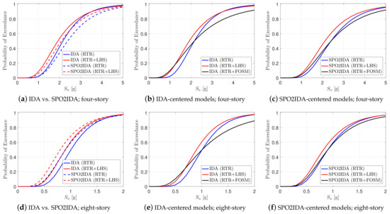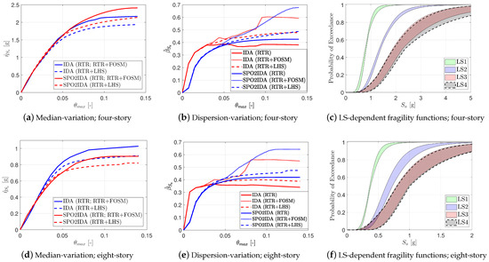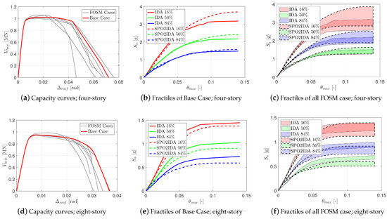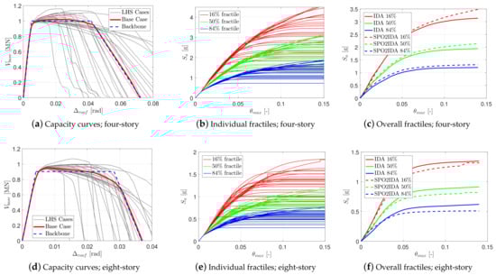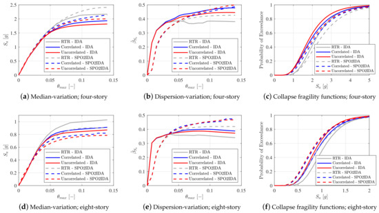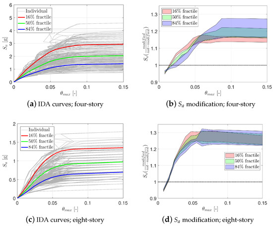 Figure 6b,e shows the IDA curves for the Base Case, in which only the RTR variability is considered (i.e., only 44 curves, with all other parameters in their mean value). These plots illustrate the summarized 16%, 50%, and 84% fractiles for both plain and modified spectral acceleration cases.
