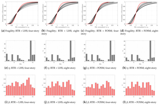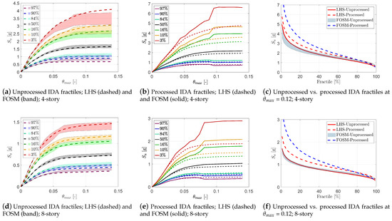 This section summarizes the results of the direct IDA method combined with LHS. For each frame, a total of 44 × 25 = 1100 distinct models-records are developed. Depending on the number of required simulations to capture the collapse in each model-record, a total of 12,614 and 6592 analyses were performed for the four-story and eight-story frames, respectively. The resulting single-record IDA curves are shown in Figure 7a,d for the four-story and eight-story frames, respectively. They include the 16%, 50%, and 84% fractiles. It may be noted that the four-story frame requires larger shaking intensity compared to the eight-story one.