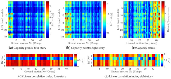 where , , and are the intercept, slope, and residual’s dispersion of the linear regression, respectively. The values are taken as and for the four-story and eight-story frames, respectively, and for both frames. These values are used assuming that the selected case studies are located at the same location as reported in [54].