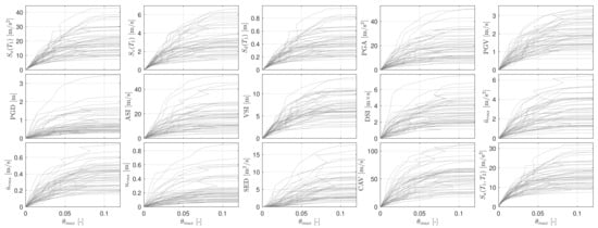Global collapse is treated separately in the PBEE framework, as its probability does not change from one damageable group to another. Applying Equation (8) requires calibration of the and parameters. Using the results from IDA (or SPO2IDA), there exist several methods to estimate the two parameters and [27,28].